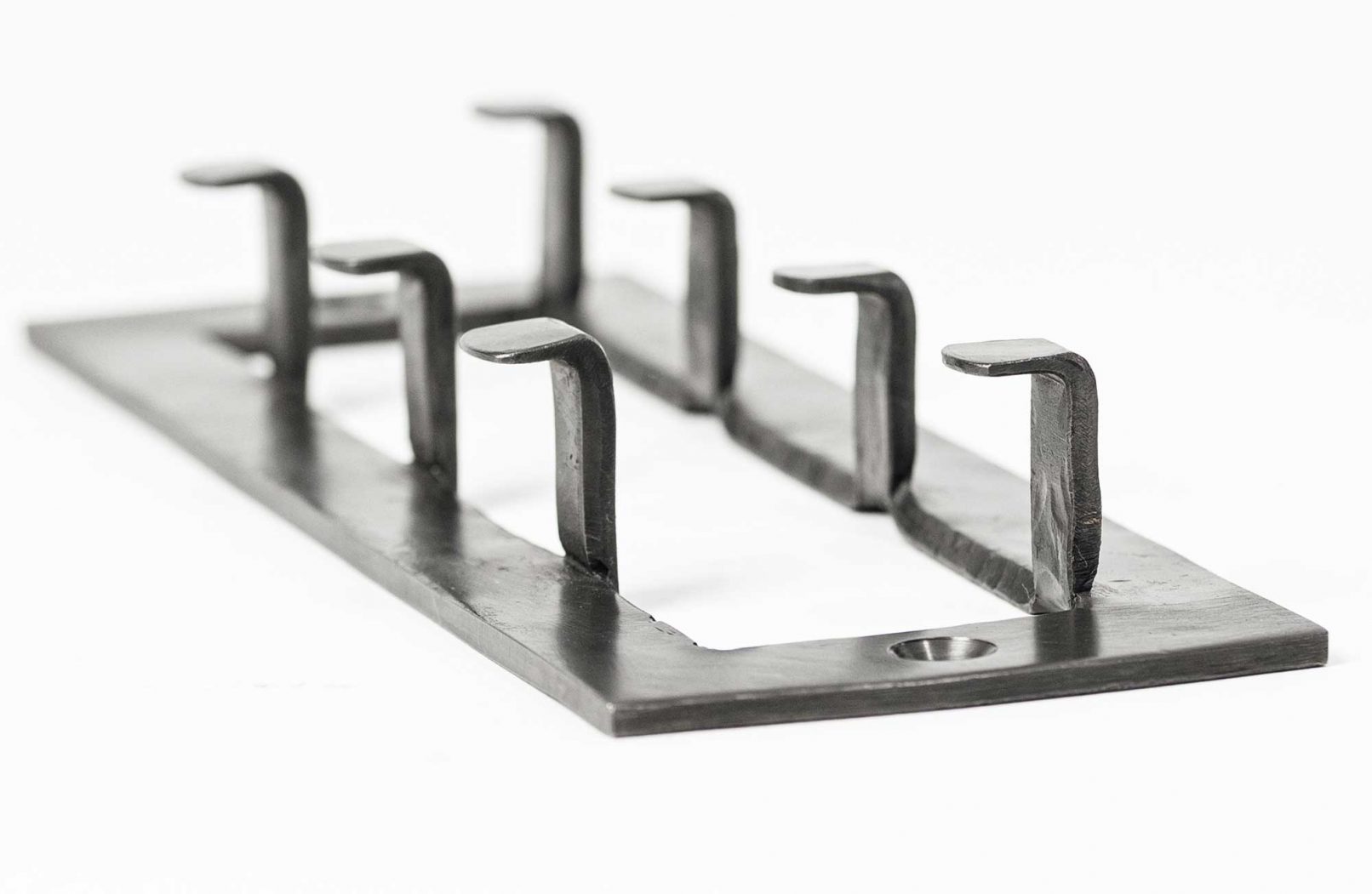 Schlüsselbrett aus 4 mm starkem Bronzeblech geschmiedet. Vorgerichtet zur Verschraubung an der Wand. Oberfläche dunkel patiniert und gewachst.